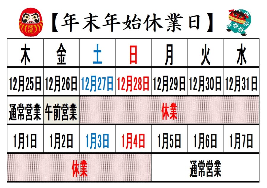【年末年始休業日程】のご案内 2025.12.15 皆様、益々ご盛栄のこととお喜び申し上げます。 平素は格別のご高配を賜り厚く御礼申し上げます。 誠に勝手ながら、下記日程にて、年末年始休業とさせて頂きます。 お客様及びお取引先様には ご不便をお掛け致しますが、何卒ご理解の程、宜しく御願い致します。 前へ 一覧に戻る 後ろへ